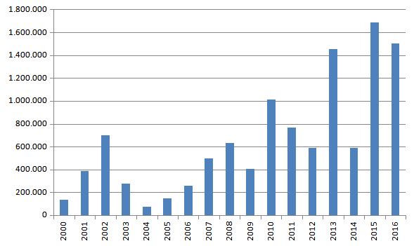 Gráfico 3 ‒ Número de casos de dengue ocorridos no Brasil entre o período de 2000 a 2016