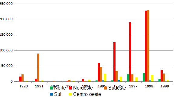 Segundo Souza (2018), o Nordeste, também apresentou um quadro grave no histórico de evolução da epidemia, sendo que em vários anos da década de 1990 superou os números de casos do Sudeste que é uma região mais populosa. Sem dúvida que as condições sociais do Nordeste eram ainda mais precárias na década de 1990 e se pode fazer uma inferência de que esse fato, aliado as condições climáticas favoráveis, em muito contribuíram para explicar esses números tão elevados.