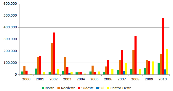 O ano de 2010 foi marcado pelo número elevado de casos, contabilizando um total de 1.011.548. Foi a primeira vez que o número de casos ultrapassou 1 milhão. Nesse ano a região Sudeste teve 478.003 casos, representando 47% de todos os casos do país.