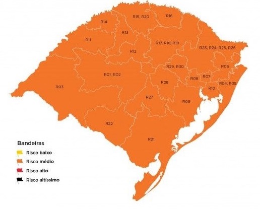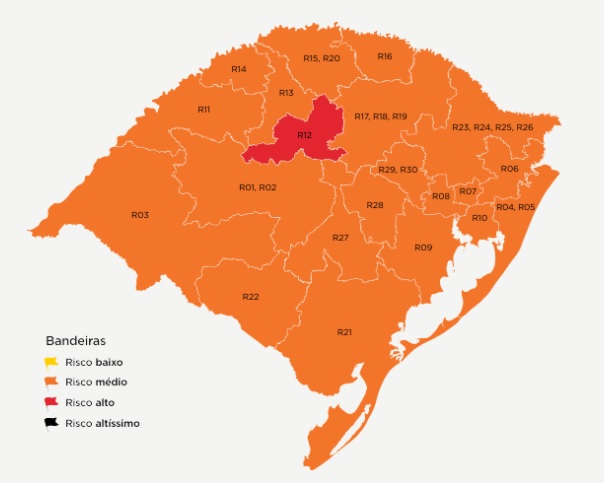 As ações adotadas pelo Rio Grande do Sul, a partir do distanciamento controlado, têm se mostrado como fundamentais para o Estado, que está dividido em 7 macrorregiões, e cada macrorregião possui outras 20 regiões, as quais são agrupadas a partir de 30 regiões de saúde, que são designadas por meio das cidades mais populosas das referidas áreas. Igualmente, a classificação é realizada por meio de bandeiras que possuem quatro cores para representar a gravidade da Covid-19 na região, sendo as cores amarela, quando há risco baixo, laranja quando há risco médio, vermelha quando o risco é alto e preta quando é apresentado um risco altíssimo (ESTADO DO RIO GRANDE DO SUL, 2020). Para uma visualização mais adequada desses aspectos, é apresentado, por meio da Figura 1, tal modelo por bandeiras.