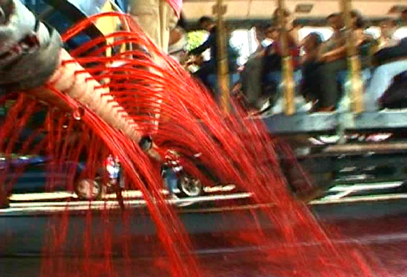 Ronald Duarte: É, muita gente não chama O Q. rola Você V, porque não consegue guardar O Q. rola Você V, como O Q. rola Você V. Chama: ah, o banho vermelho, o banho de sangue, aquele banho de sangue, sabe? Chamam de banho de sangue. Ou então o Fogo cruzado mesmo, chamam de fogo nos trilhos, são os apelidos, os nomes que as pessoas vão dando e acabam falando, às vezes até em entrevistas, apresentando o trabalho, citando com outro nome, entendeu? São os apelidos que eles vão ganhando. Como Nimbo Oxalá, muita gente chama de a nuvem, a grande nuvem, o cogumelo; em um jornal cubano saiu como a bomba da paz, não é a pomba não, a bomba da paz. Muito louco...