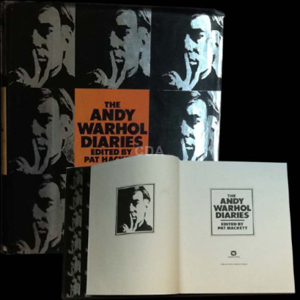 Primeira edição de The Andy Warhol Diaries, editado por Pat Hackett, publicada pela Warner Communications Company em 1989. (Fonte: Catálogo das Artes. Disponível em https://www.catalogodasartes.com.br/obra/DzBBePzz/ )