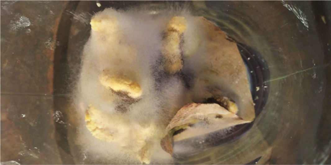 JeisiEkê de Lundu, materializar silêncios, 2021. escultura de massa de mandioca, fungos e vidro; criada na residência F(r)icções.