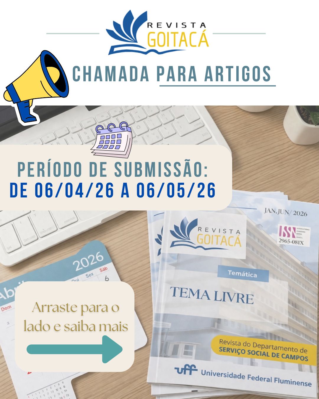 A Comitê Editorial da Revista Goitacá torna pública a nova chamada de artigos para publicação na edição V.4 (N.1 e N.2), que versará sobre “Sujeitos, Estado e Políticas sociais”.