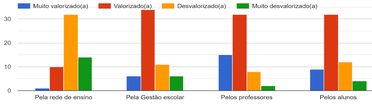 In short, it is the teachers' perception of the devaluation of their work, which we can observe when out of 57 teachers, 46 reported that they feel devalued by the education network.