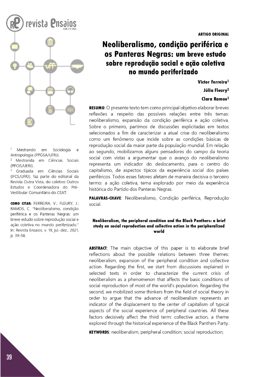 • Neoliberalismo, condição periférica e os Panteras Negras um breve estudo sobre reprodução social e ação coletiva no mundo periferizado