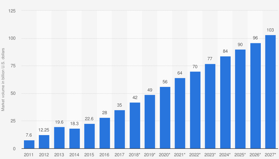 Figura 5 - Tamanho do mercado de big data com base em valores de venda, 2011 a 2027 (em bilhões de dólares