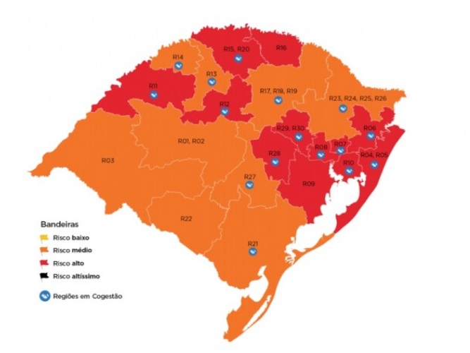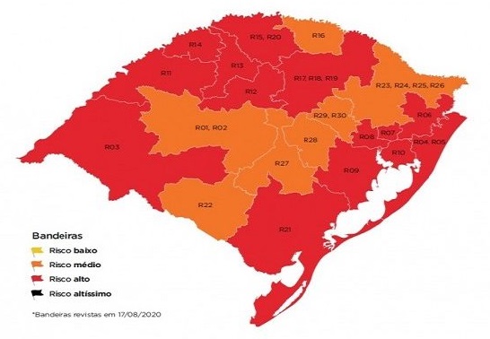 Da mesma forma, em um contexto estadual, no Rio Grande do Sul (RS), foram adotadas medidas a fim de mitigar os efeitos adversos causados pela Covid-19, como medidas sanitárias a serem seguidas, um sistema de distanciamento controlado, utilizando três formas de agrupamento das regiões do Estado. Ou seja, a classificação abrange 7 macrorregiões, as quais são divididas em 20 regiões Covid-19, sendo que estas se dividem ainda em 30 regiões de saúde, nas quais foi adotado um modelo de classificação de risco a partir de bandeiras nas cores amarela, laranja, vermelha e preta, que visam ditar as regras para a convivência social nas regiões do Estado (SEPLAG RS, 2020). Tal modelo se mostrou como um padrão a ser seguido por demais localidades, por se mostrar como uma referência eficiente e consolidada, a qual dá o aparato necessário aos gestores públicos para controlar o fluxo de pessoas (RODRIGUES et al., 2020).