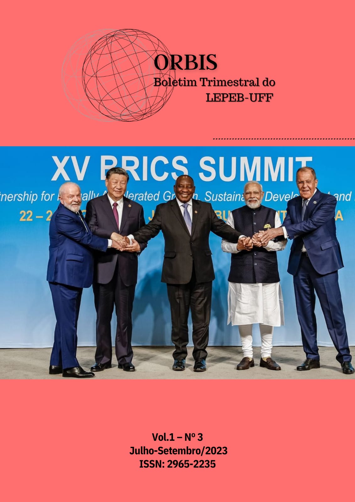v. 1 n. 3 (2023)Em seu terceiro número, o boletim ORBIS traz um conjunto de artigos sobre diferentes temáticas relacionadas aos Estudos Estratégicos e às Relações Internacionais. No âmbito mais específico da Política Externa, aparecem quatro artigos sobre questões como o possível papel do Brasil na resolução do conflito entre Rússia e Ucrânia, a ampliação do BRICS, a retomada de uma atuação mais ativa do Brasil no subcontinente sul-americano e as diferenças entre os movimentos da política externa brasileira nos primeiros meses dos governos Bolsonaro e Lula III. Já sobre a política doméstica – mas com conexões e repercussões externas – publicamos dois artigos sobre temas extremamente relevantes nos debates contemporâneos dos Estudos Estratégicos: a securitização do terrorismo na agenda doméstica brasileira e a votação no Supremo Tribunal Federal sobre a descriminalização do porte da maconha para consumo, pensada no contexto mais geral da fracassada Guerra às Drogas.