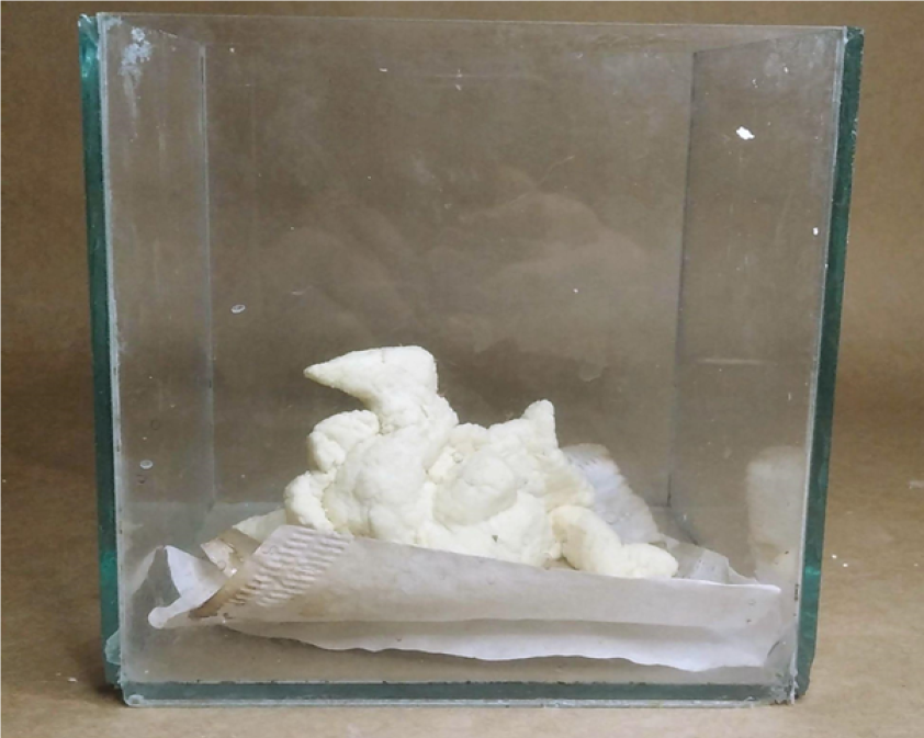JeisiEkê de Lundu, materializar silêncios, 2021. escultura de massa de mandioca, fungos e vidro; criada na residência F(r)icções.
